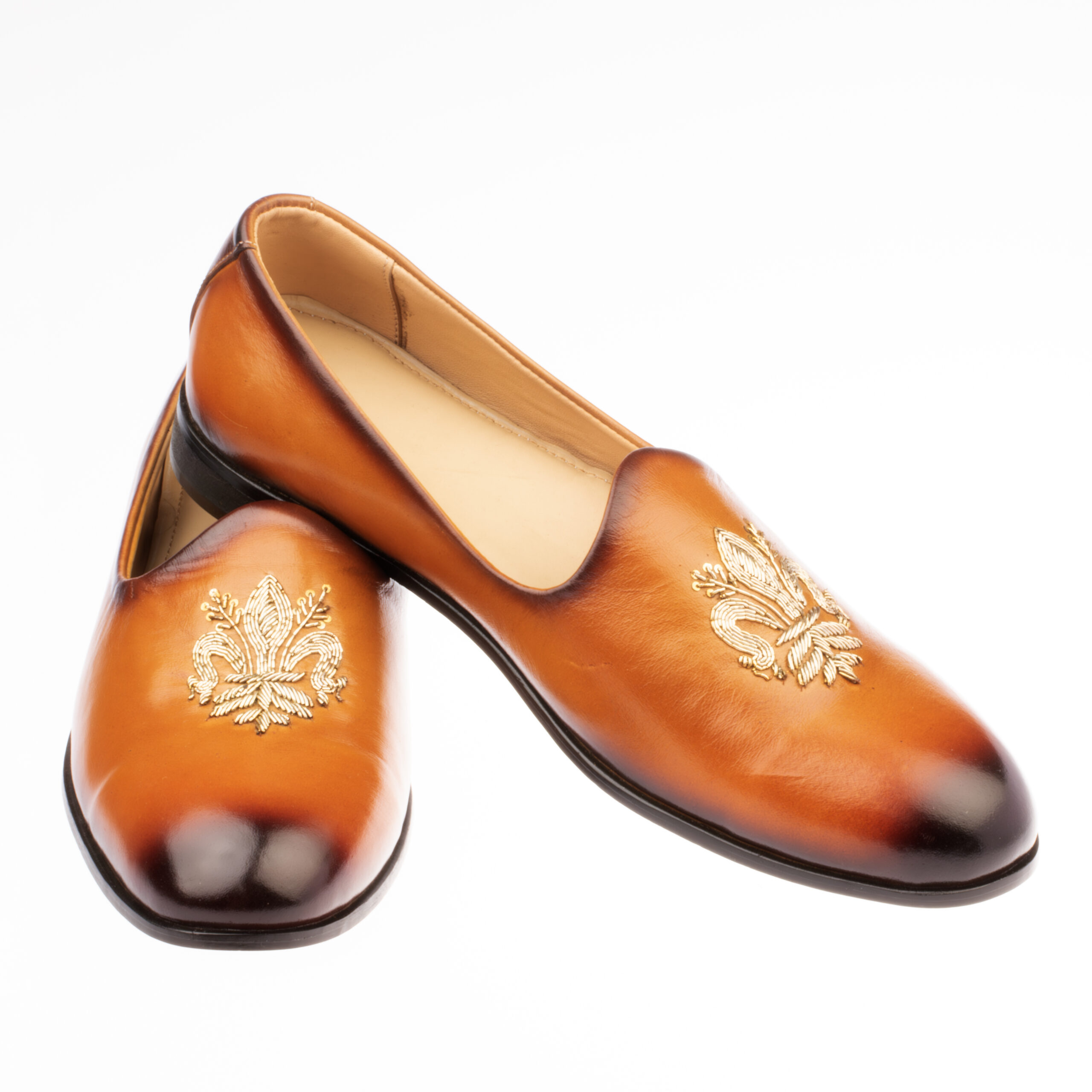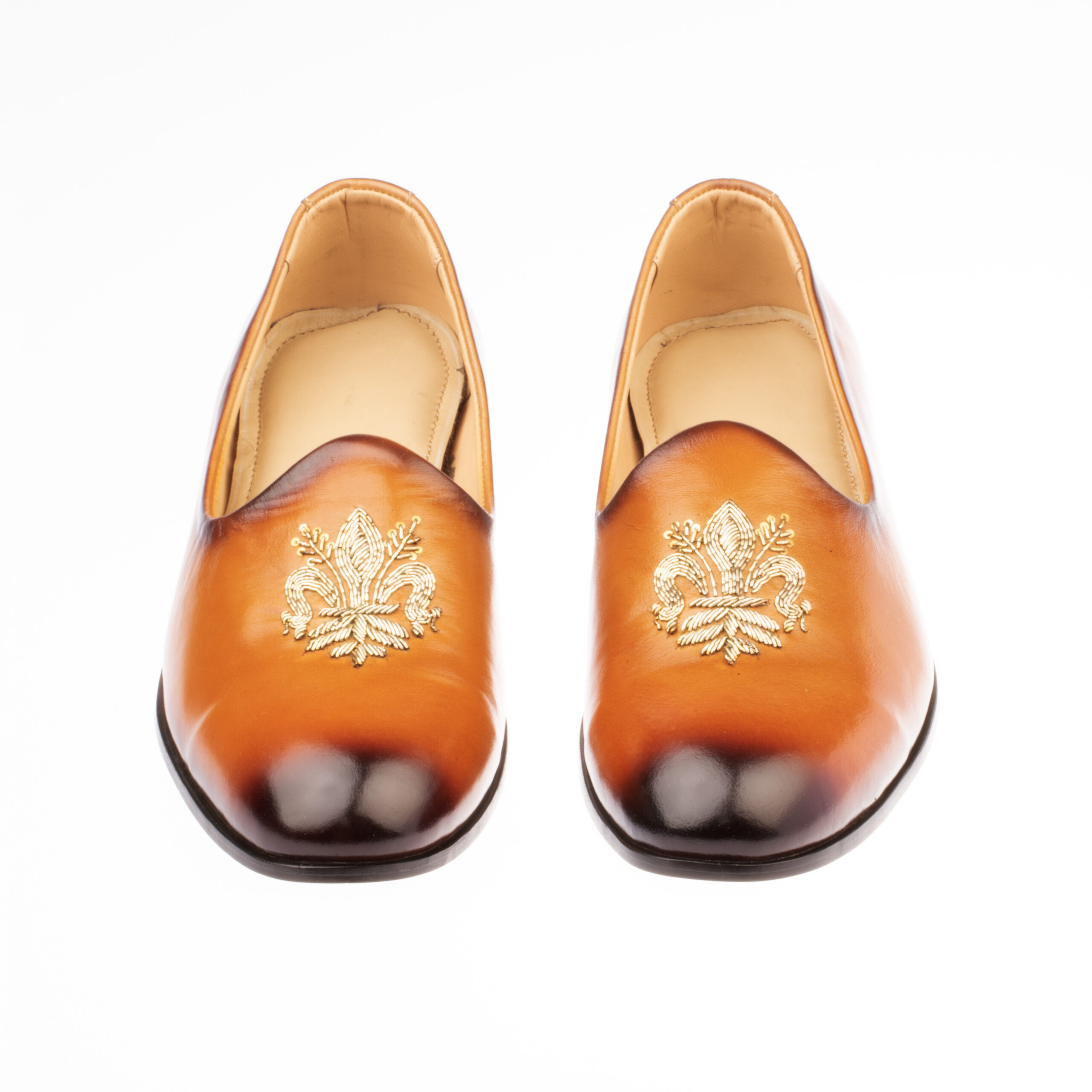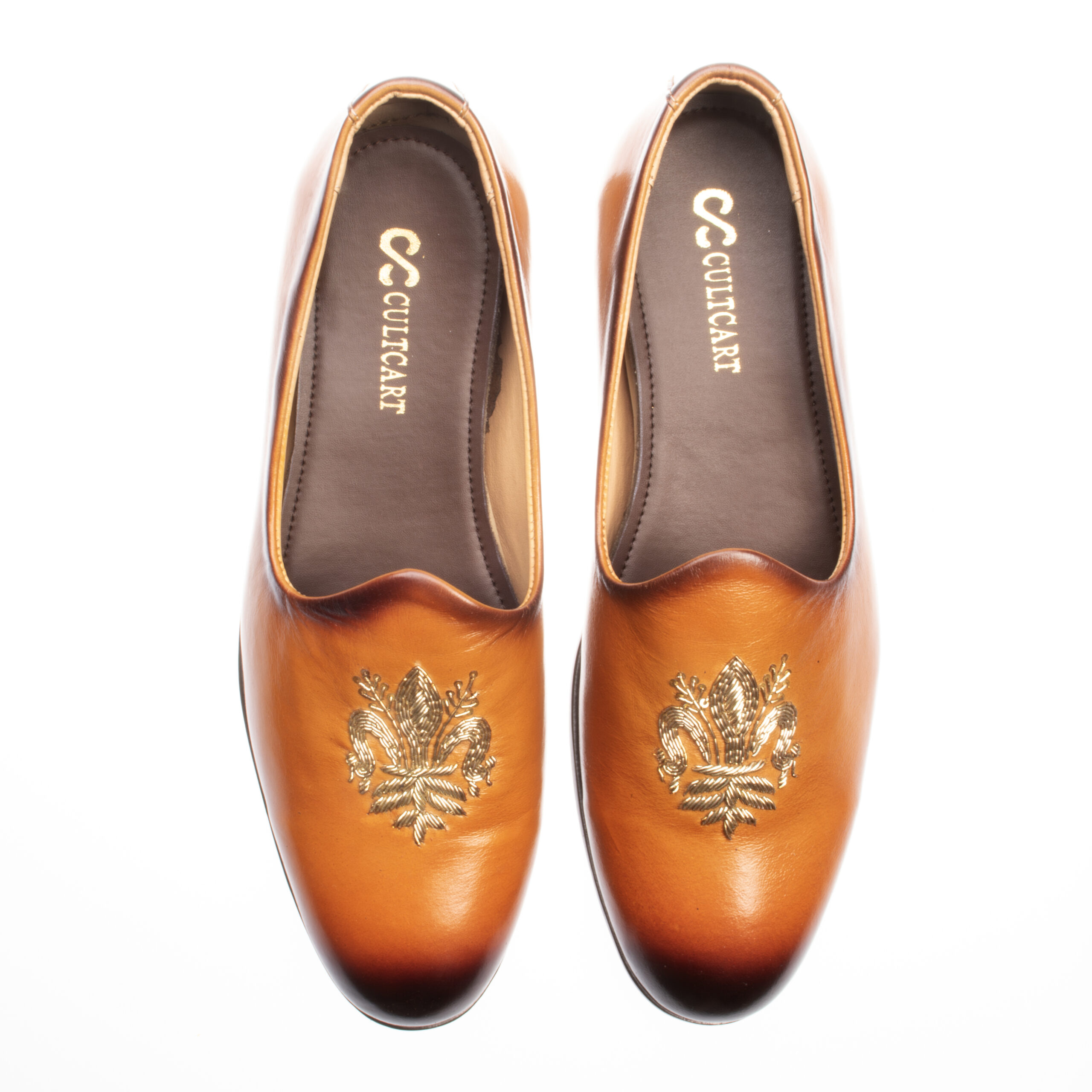A masterpiece in men’s ethnic footwear, embellished with intricate handwork and golden embroidery. Crafted from exquisite leather, these loafers epitomize luxury. Indulge in the artistry of hand-stitched elegance, featuring golden thread embroidery that adds a regal touch to these tan loafers A classic loafer style infused with cultural richness, making them a versatile and eye-catching choice for various occasions. Featuring a durable Italian sole, these loafers provide stability and a confident grip on various surfaces. Enhanced with a shoe bite protector, these loafers prioritize comfort and convenience in every step.