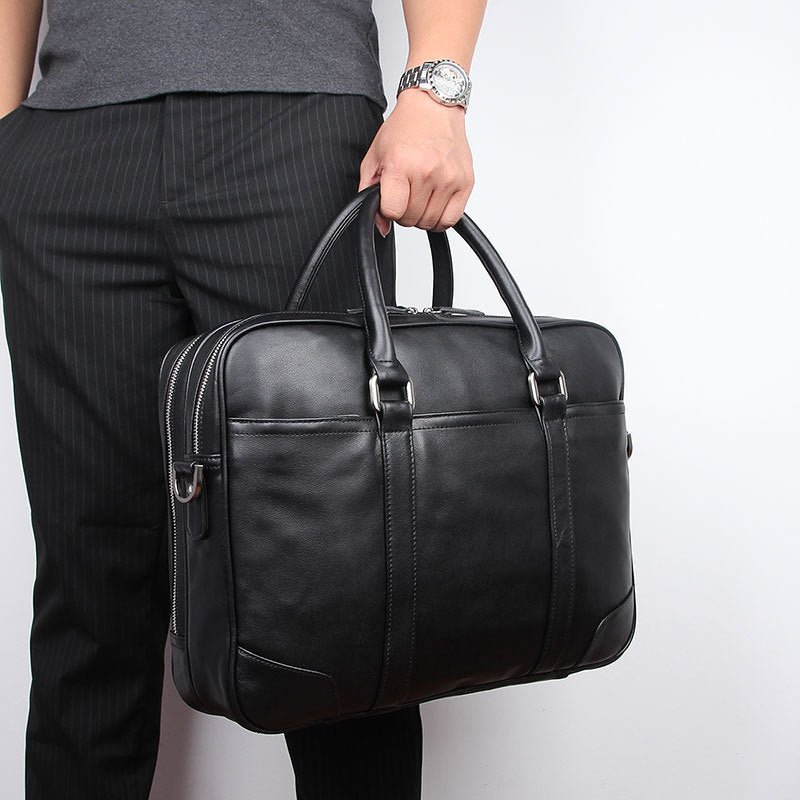 Introducing our Black Leather Laptop Briefcase Bag, crafted from supple buff leather with exquisite attention to detail. This office bag offers both functionality and style to elevate your professional look.