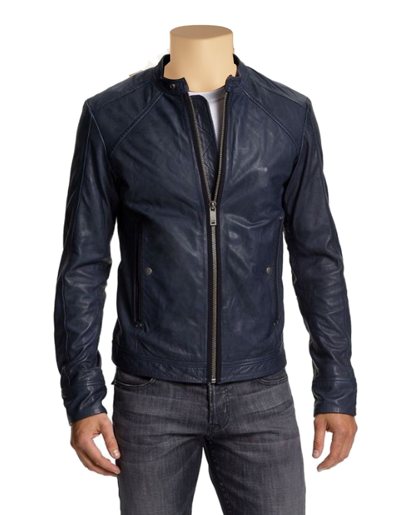 Embark on adventures with the bespoke navy blue lamb leather racer jacket handcrafted for timeless style and adventurous spirit